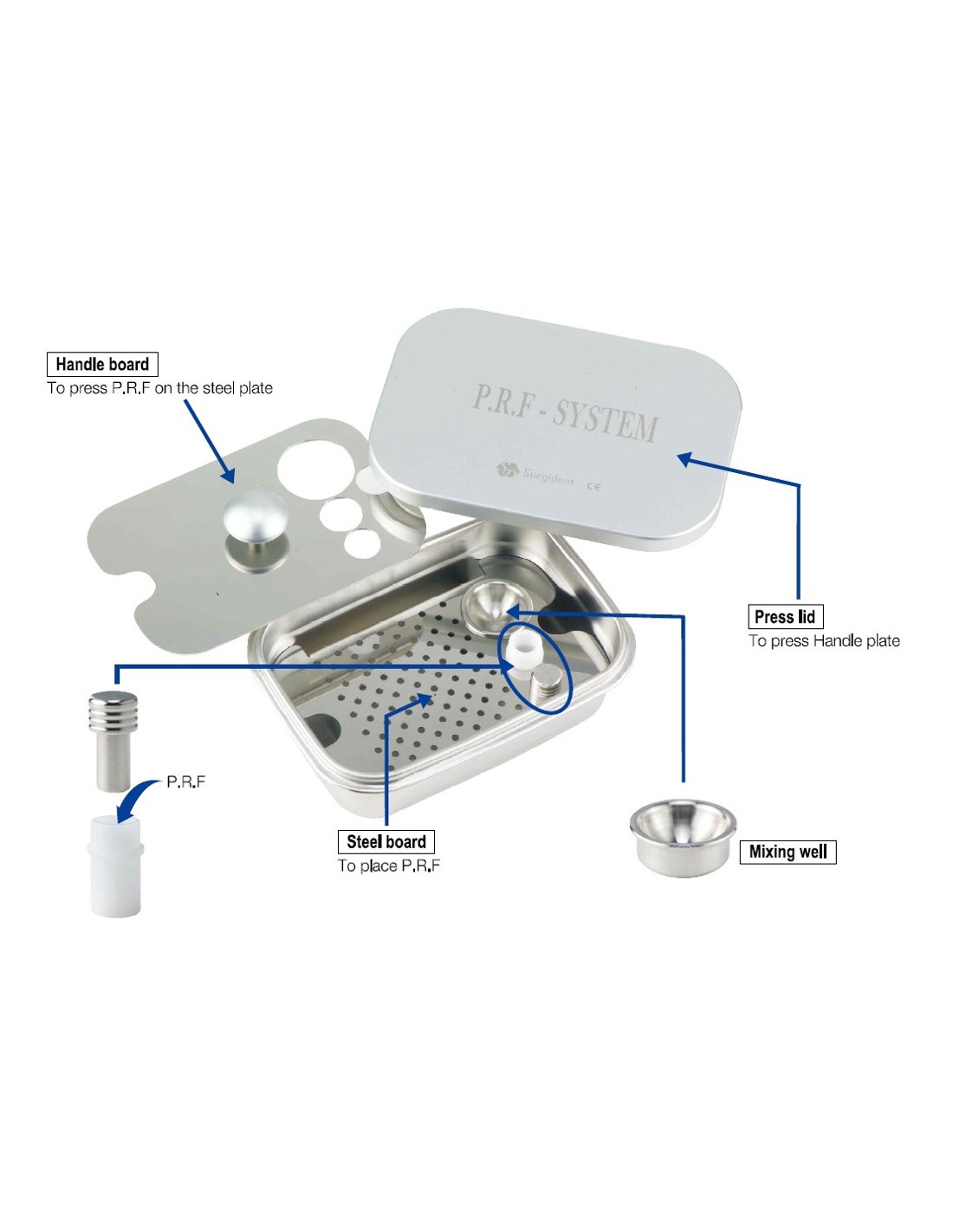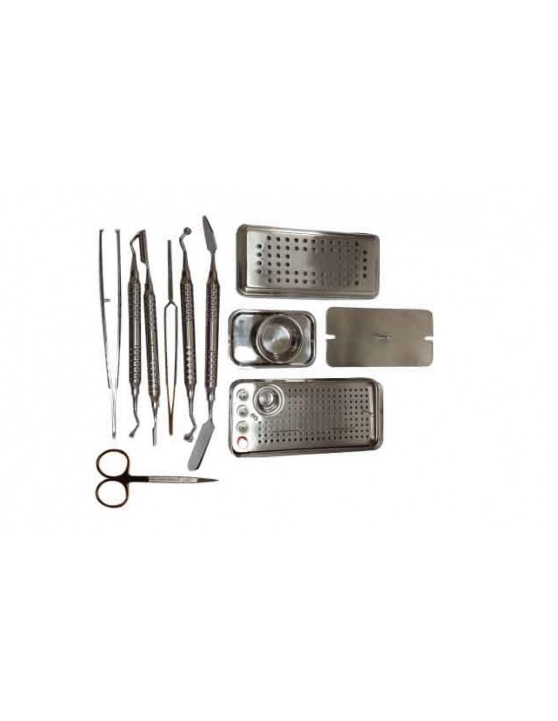 - Metalowa kaseta z zestawem narzędzi do obsługi PRF (stojaczek do fiolek, 2 pęsety, nożyczki, miseczka, tacka, 2 szpatułki, jedna typu Prichard, 2 upychacze oraz łyżeczka z upychaczem po 2 stronie)